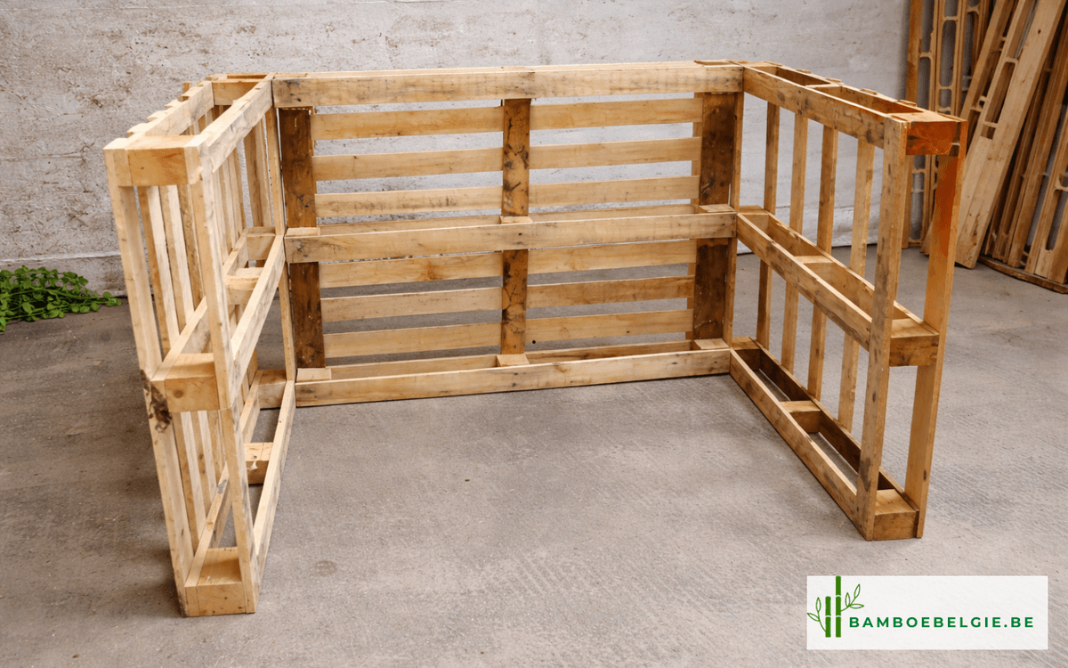 Plaats de derde pallet om de tweede hoek te vormen en controleer of deze haaks staat. Schroef alle pallets aan elkaar vast (boven, midden en onder).